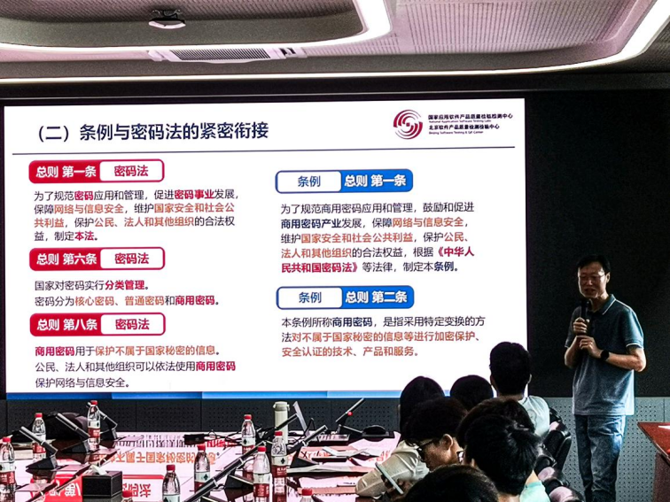 在党建共建会上,北航网安学公司党建辅导员张晗同志与北软检测中心党支部副书记郭剑虹同志分别介绍了各自支部建设情况及本次共建活动的意义。随后,北软检测中心信息安全测评实验室副主任王坤同志分享了密码法和商密条例相关内容,讲述了我国网络安全的技术发展和密码法的立法过程。