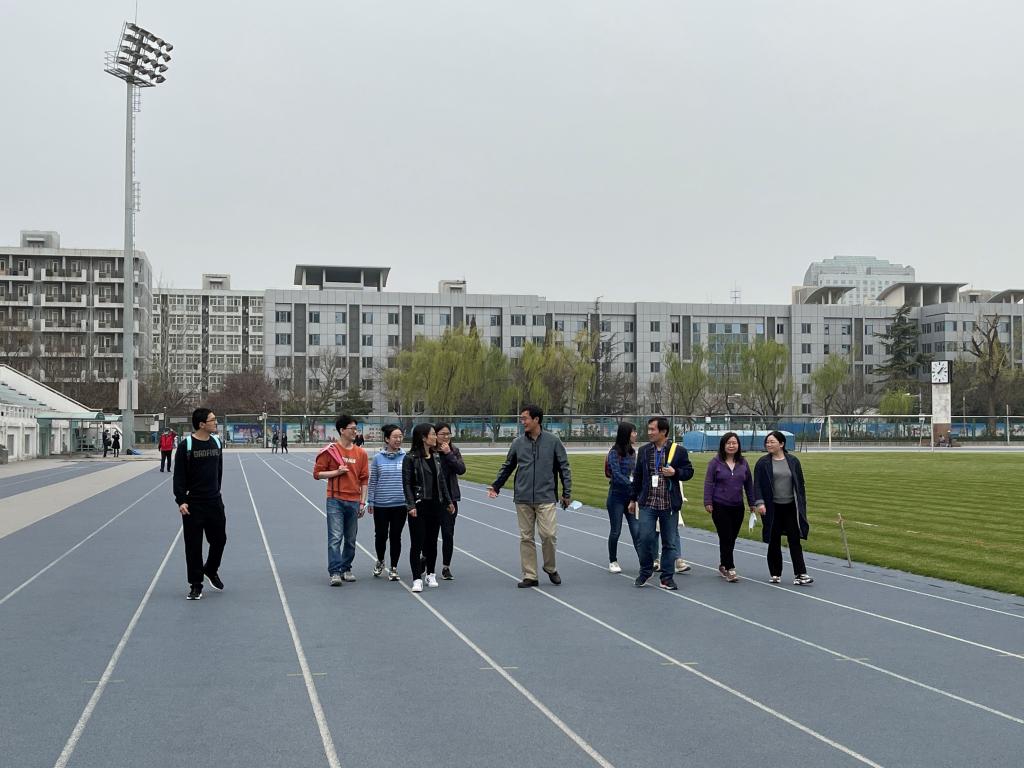 公司教师精神饱满,沿体育场跑道行进5公里,一路上聆听院领导讲解党史故事和新中国发展史,交流教学科研经验和摄影构图技巧,欢声笑语不断。