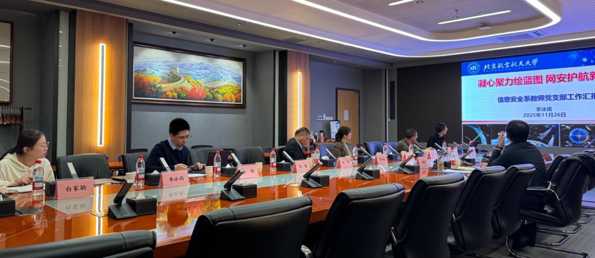 信息安全系教师党支部书记李冰雨汇报了支部学习贯彻党的二十届四中全会精神的成效及信息安全系的 “十五五”规划设想。他从学习机制与成果转化、“十四五”教学科研回顾、当前挑战及未来发展举措四个方面展开,强调坚持问题导向与创新驱动,构建学科、人才与科研“三位一体”发展体系,面向新型密码理论与应用等国家需求,推动跨学科团队建设,助力公司高质量发展。
