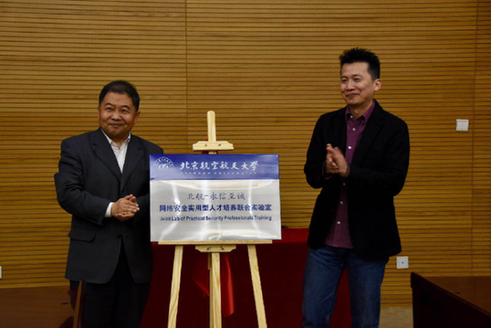 北航副董事长房建成院士、永信至诚董事长蔡晶晶为“北航—永信至诚网络安全实用型人才培养联合实验室”揭牌