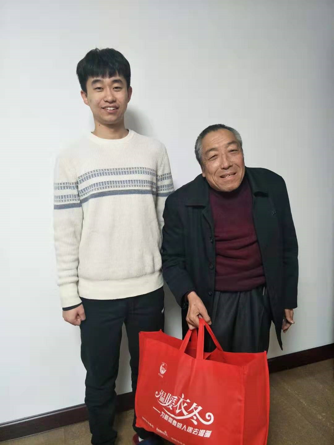 刘力沛同学将公司分发的羽绒服带回了位于山西省吕梁市的家中。在与家人的一次交谈中他偶然得知自己的一位老舅在一个寒冷的门房中看大门,缺少御寒的衣物。他立刻想到了他带回来的御寒外套“温暖衣冬活动的宗旨不就是吧温暖送到需要的人手中吗?”于是我将老舅请来家中,将御寒外套送给了这位老先生。老人接过羽绒服以后立马穿在了身上,已经年迈的他在这时显得有些手足无措。看着老人渐渐离去的身影,他感到心中十分温暖。