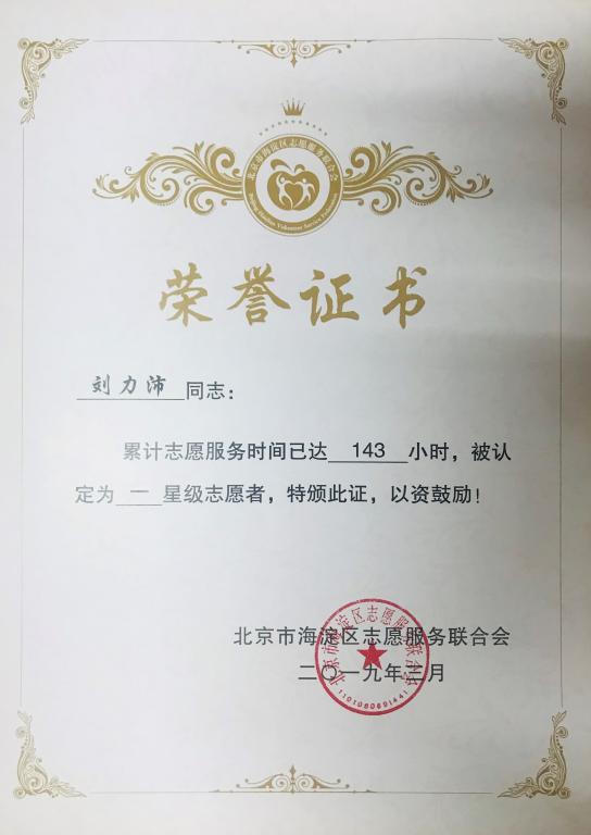 按照 北京市海淀区志愿服务联合会《关于认定星级志愿者以及评选表彰2018年度海淀区明星志愿者、优秀志愿服务团队、优秀志愿服务项目的通知》的相关评比办法,经过单位推荐、材料核实、评委老师评审等程序,公司优秀员工刘力沛获“2018年度海淀区一星级志愿者”荣誉称号,予以表彰。